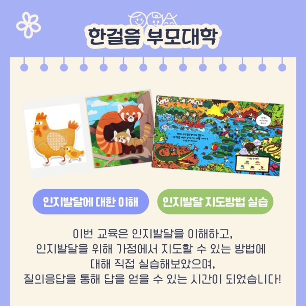 이번 교육은 인지발달을 이해하고, 인지발달을 위해 가정에서 지도할 수 있는 방법에 대해
