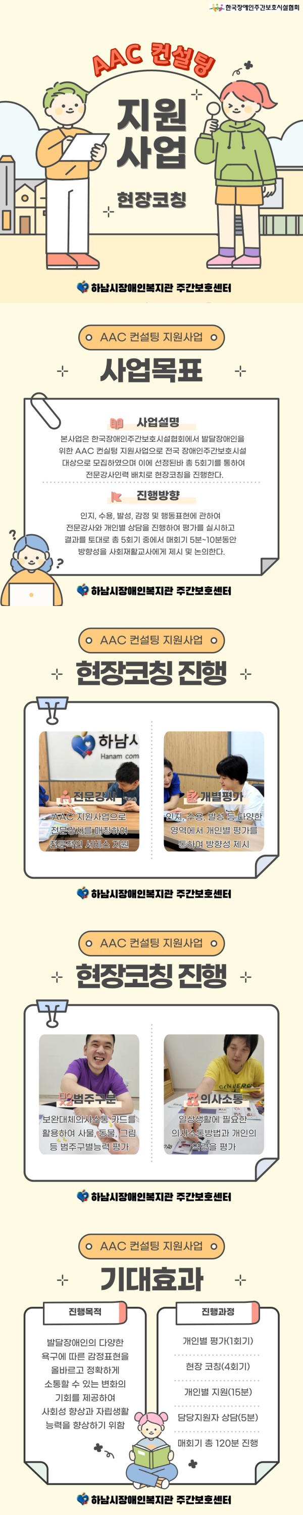 본 사업은 한국장애인주간보호시설협회에서 발달장애인을 위한 AAC 컨설팅 지원사업으로 전국 장애인주간보호시설 대상으로 모집하였으며 이에 선정됨.