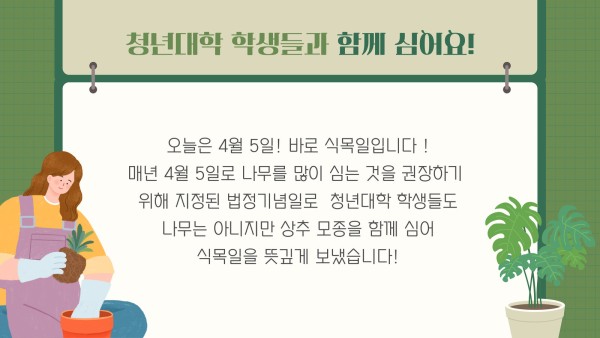 매년 4월 5일로 나무를 많이 심는 것을 권장하기 위해 지정된 법정기념일로 청년대학 학생들도 나무는 아니지만 상추 모정을 함께 심어 식목일을 뜻깊게 보냈습니다!