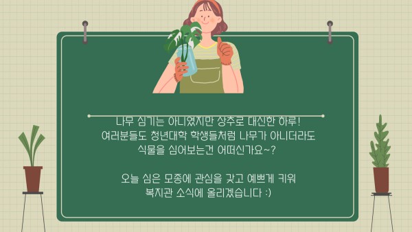여러분도 청년대학 학생들처럼 나무가 아니더라도 식물을 심어보는건 어떠신가요~?