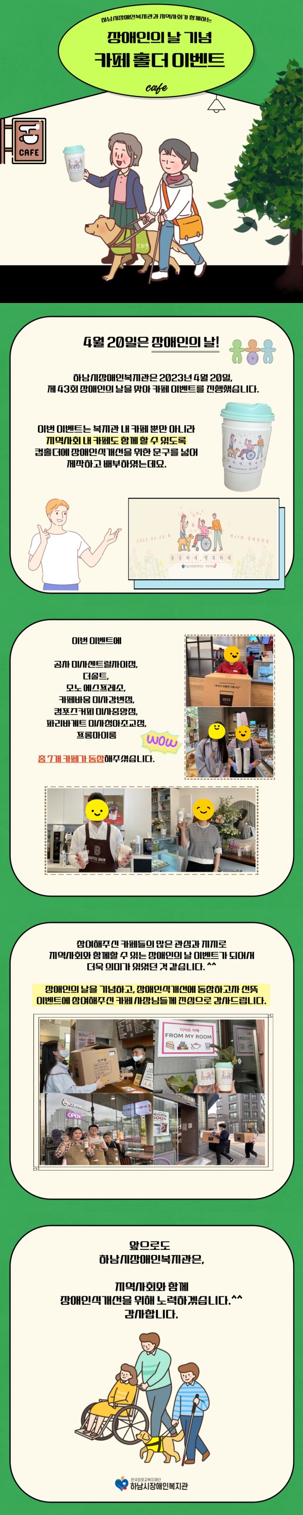 참여해 주신 카페들의 많은 관심과 지지로 지역사회와 함께할 수 있는 장애인의 날 이벤트가 되어서 더욱 의미가 있었던 것 같습니다.