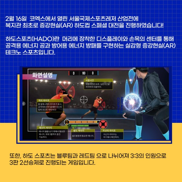 2월 16일 코엑스에서 열린 서울국제스포츠레저 산업전에 복지관 최초로 증강현실(AR) 하도컵 스페셜 대전을 진행하였습니다!