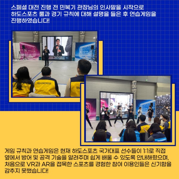 게임규칙과 연습게임은 현재 사도스포츠 국가대표 선수들이 1:1로 직접 옆에서 방어 및 공격 기술을 알려주며 쉽게 배울 수 있도록 안내해줬으며, 처음으로 VR과 AR을 접목한 스포츠를 경험한 참여 이용인들은 신기함을 감추지 못했습니다!