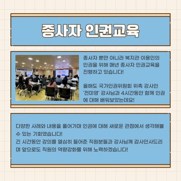 종사자뿐만 아니라 복지관 이용인의 인권을 위해 매년 종사자 인권교육을 진행하고 있습니다!
