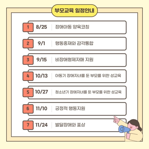 8/25 장애아동 양육코칭, 9/1 행동중재와 감각통합, 9/15 비장애형제자매 지원