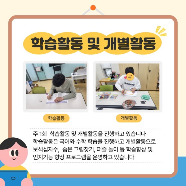 학습 활동은 국어와 수학 학습을 진행하고 개별 활동으로 보석십자수, 숨은 그림 찾기, 퍼즐 놀이 등 학습 향상 및 인지 기능 향상 프로그램을 운영하고 있습니다