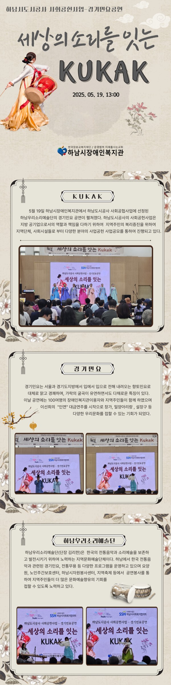 5월 19일 하남시장애인복지관에서 하남도시공사 사회공헌사업에 선정된 하남우리소리예술단의 경기민요 공연이 펼쳐졌다. 하남도시공사의 사회공헌사업은 지방 공기업으로서의 역할과 책임을 다하기 위하여 지역주민의 복지증진을 위하여 지역사회 사회시설들로부터 다양한 분야의 사회공헌 사업공모를 통하여 진행되고 있다.