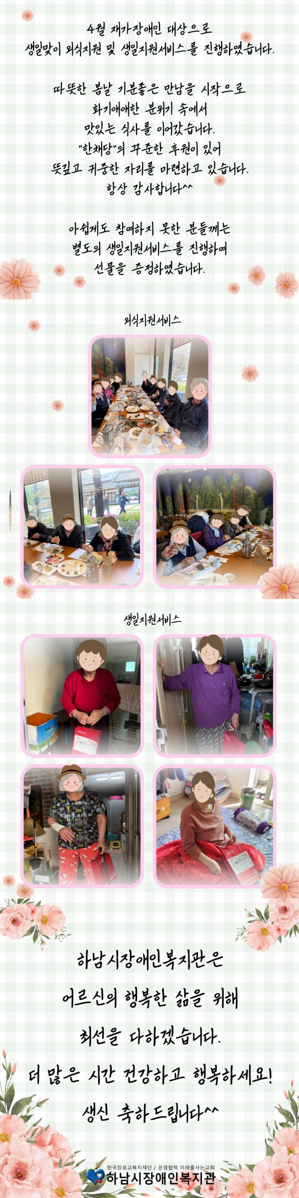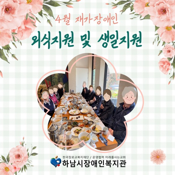 지역사회개발 4월 외식지원&생일지원 서비스 진행 페이지 정보 작성자 하남시장애인복지관 작성일25-04-28 18:47 조회수152 본문 자세히 보기자세히 보기4월 재가장애인외식지원 및 생일지원4월 재가장애인 대상으로생일맞이 외식지원 및 생일지원서비스를 진행하였습니다.따뜻한 봄날 기분좋은 만남을 시작으로화기애애한 분위기 속에서맛있는 식사를 이어갔습니다."한채당"의 꾸준한 후원이 있어뜻깊고 귀중한 자리를 마련하고 있습니다.항상 감사합니다^^아쉽게도 참여하지 못한 분들께는별도의 생일지원서비스를 진행하여선물을 증정하였습니다.하남시장애인복지관은어르신의 행복한 삶을 위해최선을 다하겠습니다.더 많은 시간 건강하고 행복하세요!생신 축하드립니다^^ 목록 이전글 장애인활동지원사업 이용인나들이 25.04.29 다음글 [직업능력개발] 4월, 야간휴일 프로그램 '우리함께 자조모임'ʕ•̫͡•ʔ♬✧ 25.04.28