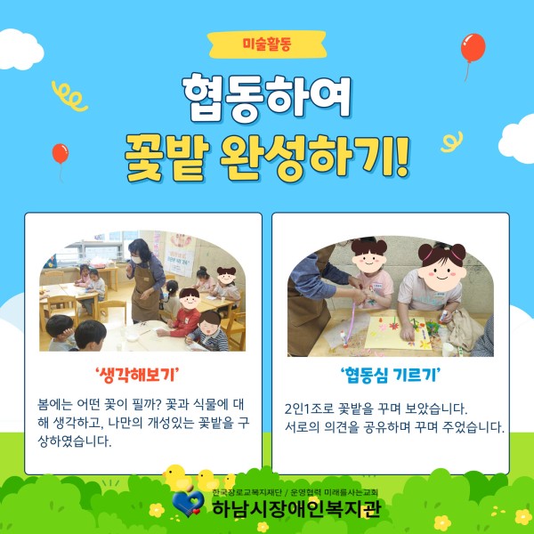 이러한 협동 작업을 통해 공동체 의식을 기를 수 있으며 미술 활동을 통해