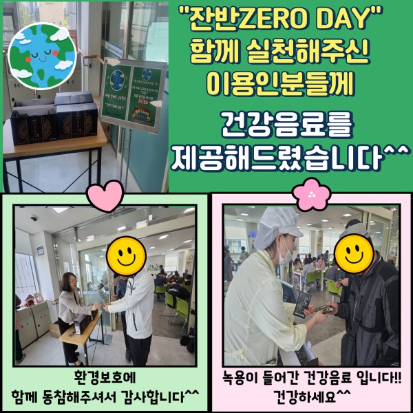 경영지원 "잔반 ZERO DAY" 페이지 정보 작성자 하남시장애인복지관 작성일25-04-28 15:26 조회수126 본문 자세히 보기자세히 보기자세히 보기자세히 보기 ♥ 매월 셋째주 금요일은 "잔반 ZERO DAY"♡음식물 쓰레기를 20% 줄이면?* 온실가스 배출량 감소* 에너지 절약♥ 3월 일평균 음식물 폐기량: 75L 4월 잔반 ZERO DAY 음식물 폐기량: 55L 하루음식물 폐기량 20L 감소 ♡"잔반 ZERO DAY" 함께 실천해주신 이용인분들께 건강음료를 제공해드렸습니다!! 검색 목록 이전글 2025년 상반기 소방모의훈련 실시 25.05.28 다음글 장애인의날 기념 "쉐프특식" 제공 25.04.21