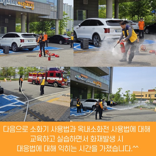 다음으로 소화기 사용법과 옥내소화전 사용법에 대해 교육하고 실습하면서 화재 발생 시 대응법에 대해 익히는 시간을 가졌습니다^^