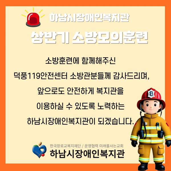 소방훈련에 함께해주신 덕풍119안전센터 소방관분들께 감사드리며, 앞으로도 안전하게 복지관을 이용하실 수 있도록 노력하는 하남시장애인복지관이 되겠습니다.