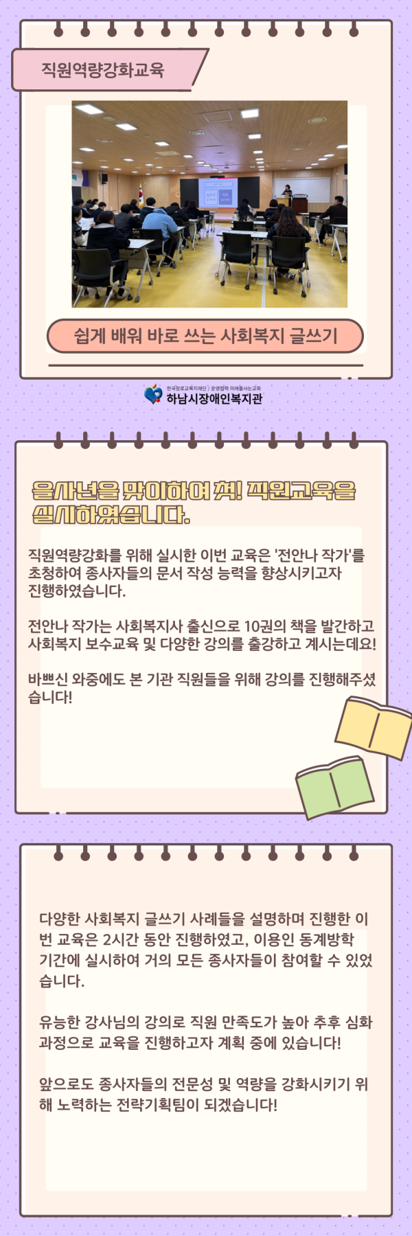 직원역량강화를 위해 실시한 이번 교육은 전안나 작가를 초청하여 종사자들의 문서 작성 능력을 향상시키고자 진행하였습니다.