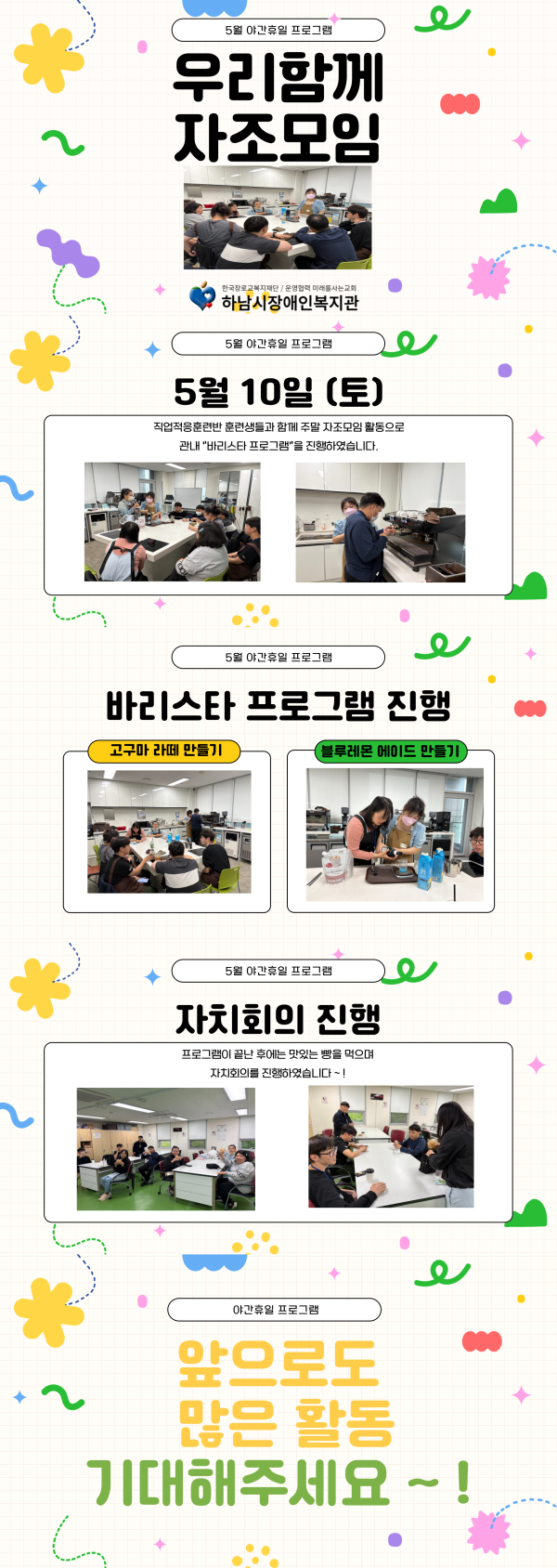 직업능력개발 [직업능력개발]5월, 야간휴일 프로그램 '우리함께 자조모임'(˶ˆᗜˆ˵) 페이지 정보 작성자 하남시장애인복지관 작성일25-05-12 16:25 조회수148 본문 자세히 보기자세히 보기5월 우리함께 자조모임5월 10일 (토) 직업적응훈련반 훈련생들과 함께 주말자조모임 활동으로 관내 "바리스타 프로그램"을 진행하였습니다고구마 라떼도 만들고 블루레몬 에이드도 만들며 재미난 시간을 가졌습니다프로그램이 끝난 후에는 맛있는 빵을 먹으며 자치회의도 진행하였습니다.앞으로도 많은 활동 기대해주세요 ~ ! 검색 목록 이전글 [직업능력개발팀] 하남시지방보조금지원사업_전환교육 “미래로(路)” 1차시 진행 25.05.14 다음글 [직업능력개발] 4월, 야간휴일 프로그램 '우리함께 자조모임'ʕ•̫͡•ʔ♬✧ 25.04.28