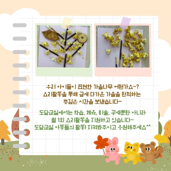 도담교실에서는 나뭇잎이 알록달록 물들어가는 가을을 맞이해 요리활동으로 ‘팝콘과자나무’를 만들어보았습니다.