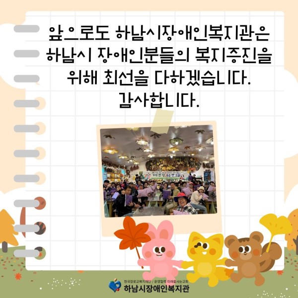 하남시장애인복지관은 앞으로도 이용자분들이 다양한 문화ㆍ여가활동을 통해 삶의 활력을 얻을 수 있도록 지속적으로 맞춤형 프로그램을 운영할 예정입니다.