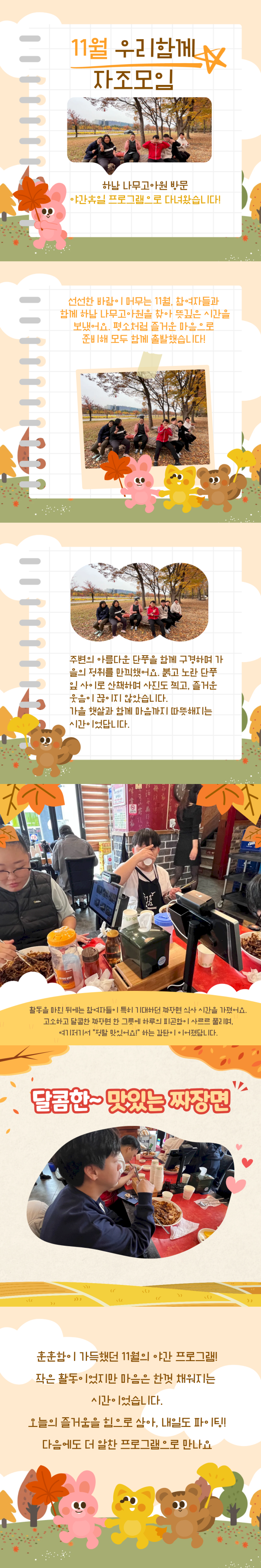 훈훈함이 가득했던 11월의 야간 프로그램! 작은 활동이었지만 마음은 한껏 채워지는 시간이었습니다.