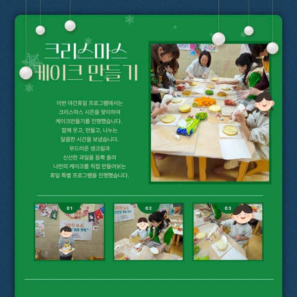 부드러운 생크림과 신선한 과일을 듬뿍 올려 나만의 케이크를 직접 만들어보는 휴일 특별 프로그램을 진행했습니다.