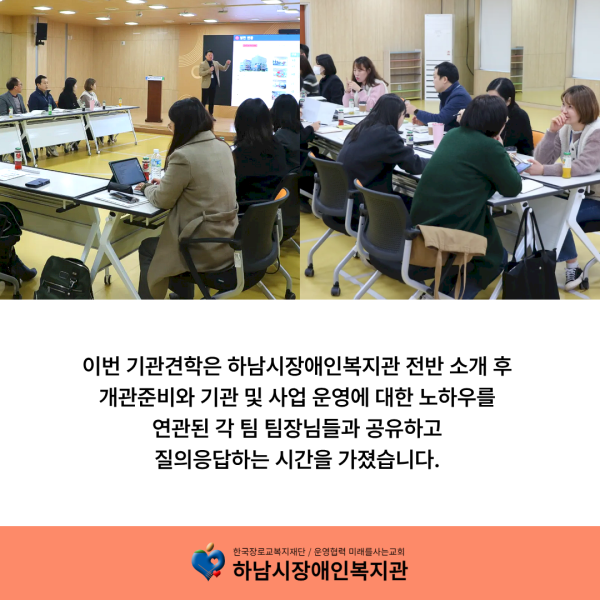 이번 기관견학은 하남시장애인복지관 전반 소개 후 개관준비와 기관 및 사업 운영에 대한 노하우를 연관된 각 팀 팀장님들과 공유하고 질의응답하는 시간을 가졌습니다.
