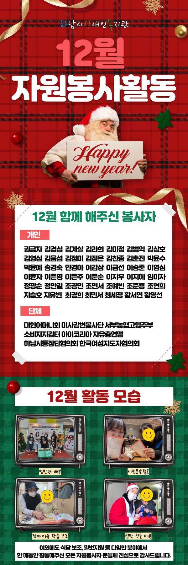 22년 12월 나눔의 손길 페이지 정보 작성자 관리자 작성일23-01-03 11:31 조회수458 본문 목록 이전글 23년 1월 나눔의 손길 23.02.02 다음글 자원봉사 분야 안내 (2018.08.28 기준) 18.08.28