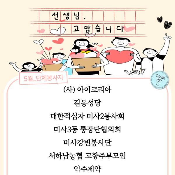 (사)아이코리아 길동성당 대한적십자 미사2봉사회 미사3동통장단협의회 미사강변봉사단 서하남농협고향주부모임 익수제약
