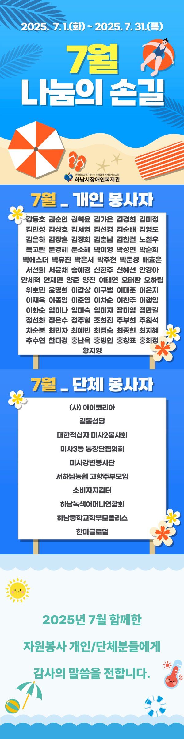 2025년 7월 함께한 자원봉사 개인/단체분들에게 감사의 말씀을 전합니다.
