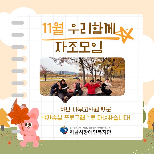11월 8일, 직업능력개발팀에서는 11월 야간휴일 프로그램으로 하남 나무고아원에서 가을의 정취를 만끽하였습니다.