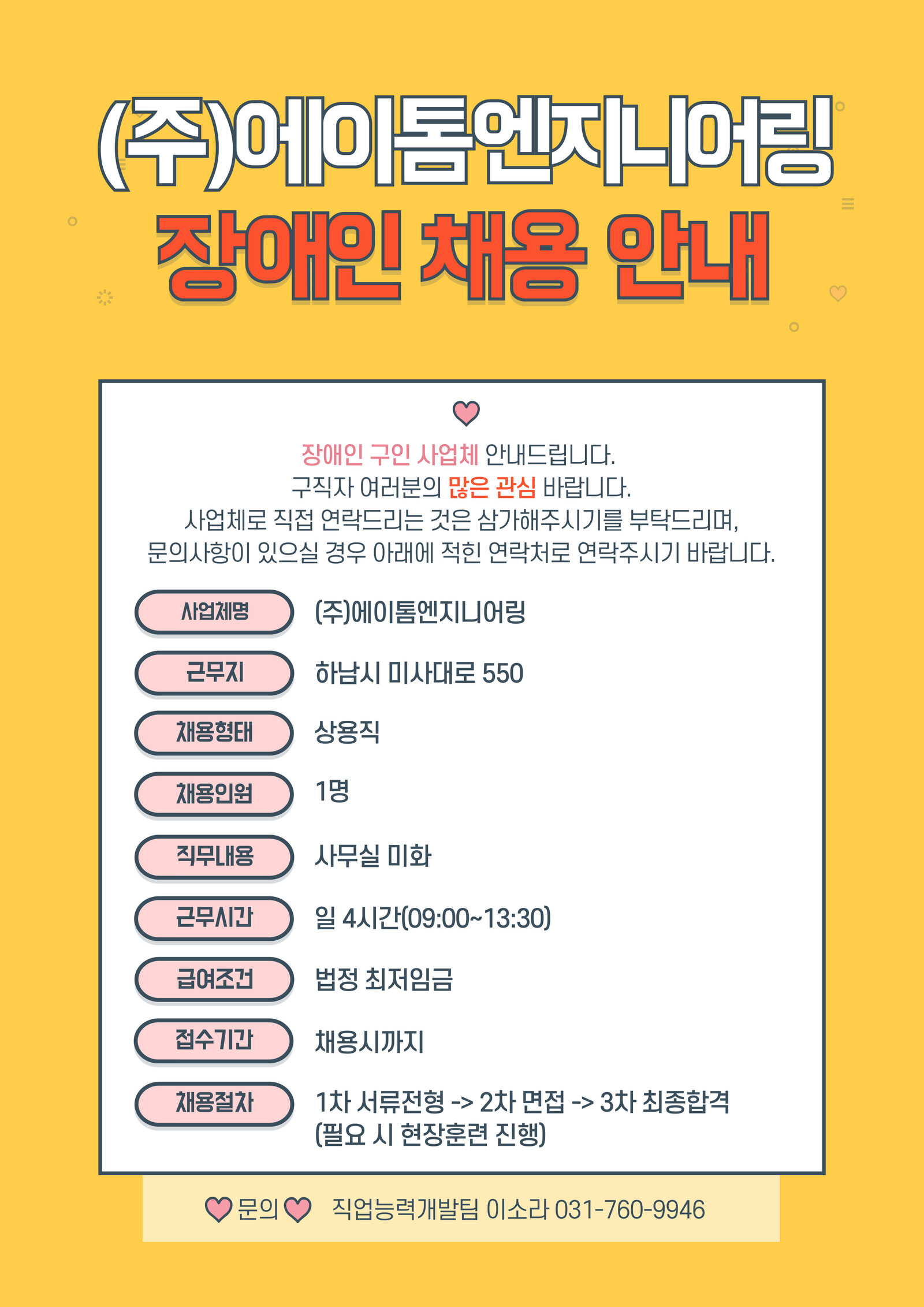 [장애인채용] 에이톰엔지니어링 장애인 채용공고 페이지 정보 작성자 하남시장애인복지관 작성일25-02-13 20:28 조회수215 본문 목록 이전글 [장애인채용] 강동구립해공노인복지관 장애인 채용공고 25.02.13 다음글 [장애인채용] 은빛사랑채영락노인주간보호센터 장애인 채용 공고 25.01.24