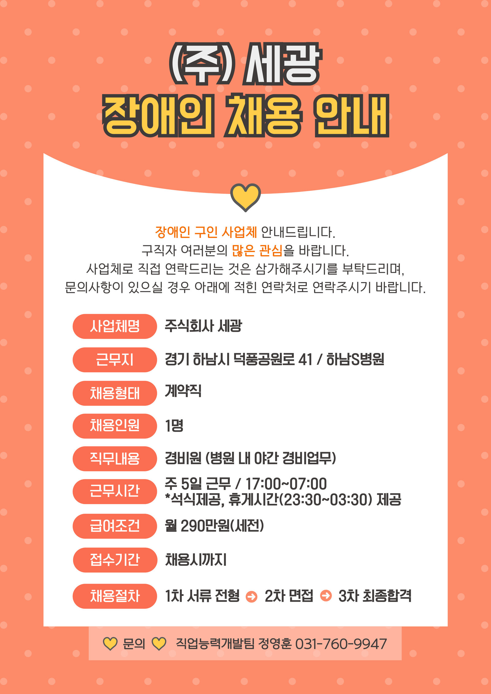 [장애인채용] (주)세광 장애인 채용공고_야간 경비원 페이지 정보 작성자 하남시장애인복지관 작성일25-04-23 16:35 조회수125 본문 목록 이전글 [장애인채용] (주)세광 장애인 채용공고_주차 관리원 25.04.23 다음글 [장애인채용] 벤투싹쿠아 장애인 채용 안내 25.02.27