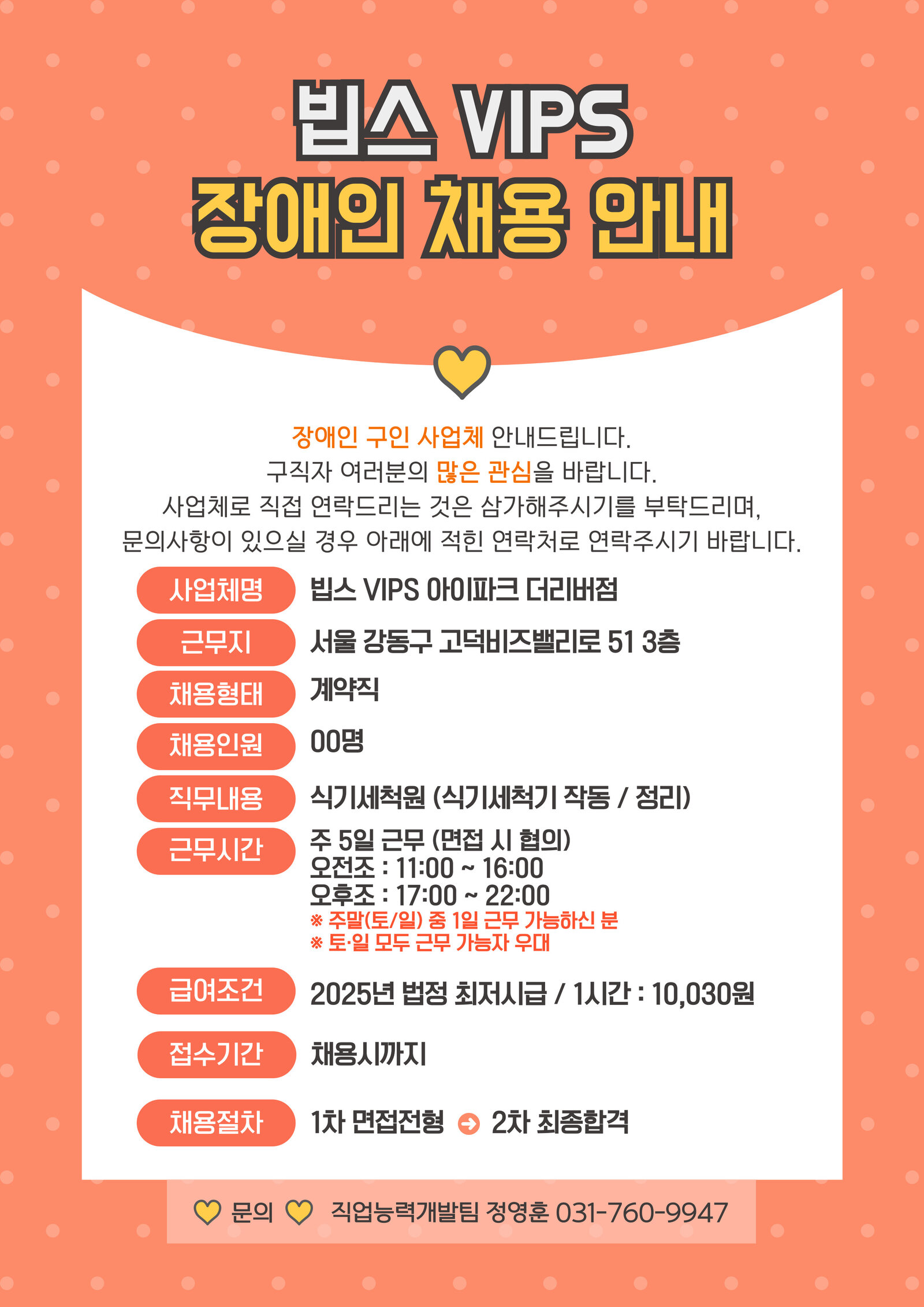 [장애인채용] 빕스VIPS 아이파크 더리버점 장애인 채용공고 페이지 정보 작성자 하남시장애인복지관 작성일25-04-23 16:37 조회수201 본문 목록 이전글 [장애인채용] (주) 화응건설 장애인 채용공고_사무보조 25.04.23 다음글 [장애인채용] (주)세광 장애인 채용공고_주차 관리원 25.04.23