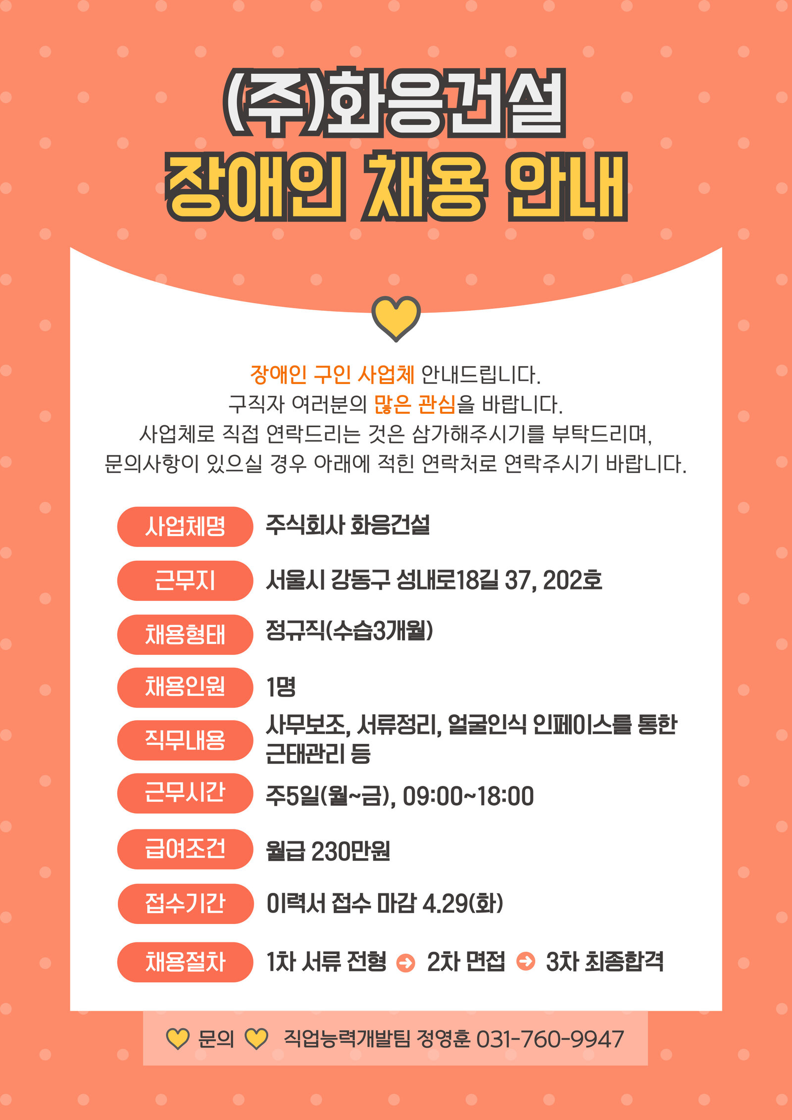 [장애인채용] (주) 화응건설 장애인 채용공고_사무보조 페이지 정보 작성자 하남시장애인복지관 작성일25-04-23 16:44 조회수189 본문 목록 이전글 [장애인채용] (주) 삼성물산 장애인 채용공고_사무보조 및 행정업무 채용(~6.2.(월) 접수마감) 25.05.20 다음글 [장애인채용] 빕스VIPS 아이파크 더리버점 장애인 채용공고 25.04.23