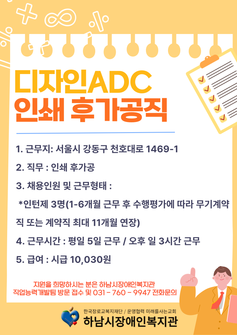 [장애인채용] 디자인ADC 장애인 채용공고_ 인쇄 후가공직 페이지 정보 작성자 하남시장애인복지관 작성일25-05-20 16:13 조회수125 본문 목록 이전글 [장애인채용] (주)에스코어 장애인 채용공고_ 사무보조 25.05.22 다음글 [장애인채용] (주)렌탈 장애인 채용공고_ 사무보조 및 행정업무 채용 25.05.20