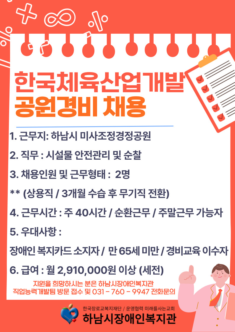 [장애인채용] (주)한국체육산업개발_미사경정 공원 경비직 장애인 채용 페이지 정보 작성자 하남시장애인복지관 작성일25-06-05 11:42 조회수208 본문 목록 이전글 [장애인채용] 올모_아트워크직 장애인 채용 25.06.09 다음글 [장애인채용] 하이루미 보호 작업장_생산직 장애인 채용 25.06.02