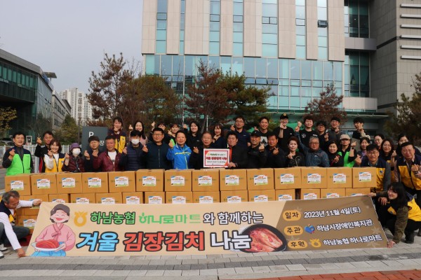 하남시장애인복지관, 2023년 하남농협 하나로마트와 함께하는 겨울 김장김치 나눔 행사 페이지 정보 작성자 하남시장애인복지관 작성일23-11-27 11:12 조회수49 본문 하남시장애인복지관이 지난 4일 하남농협 하나로마트로부터 김장김치 400포기와 쌀 400kg를 후원 받아 하남시 재가 장애인의 건강한 겨울나기를 위한 겨울 김장김치 나눔 행사를 진행하며 촬영한 사진입니다.기사원문보기 목록 이전글 하남시장애인복지관, 장애인 고용 사업주 간담회 실시 23.12.08 다음글 하남시 하나캐피탈, 장애인 직업훈련을 위한 환경개선사업에 후원 23.11.27