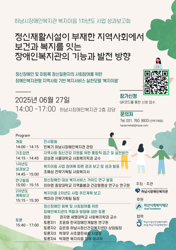 하남시장애인복지관, 아산사회복지재단 정신장애인 기획사업 복지이음 1차년도 성과보고회 개최 예정 페이지 정보 작성자 하남시장애인복지관 작성일25-06-10 15:25 조회수56 본문 아산사회복지재단의 지원을 받아 2024년 7월부터 진행된 ‘복지이음’ 사업의 성과를 공유하고, 정신재활시설이 없는 지역사회에서 장애인복지관이 수행할 수 있는 복지서비스 실천모델을 제시하기 위해 마련한 사업성과보고회 포스터입니다.기사원문보기 목록 이전글 시립나룰어린이집, 하남시장애인복지관에 플리마켓 수익금 전달 25.06.23 다음글 하남시장애인복지관, '청봉병원'과 의료지원시스템 구축을 위한 업무협약 체결 25.06.13