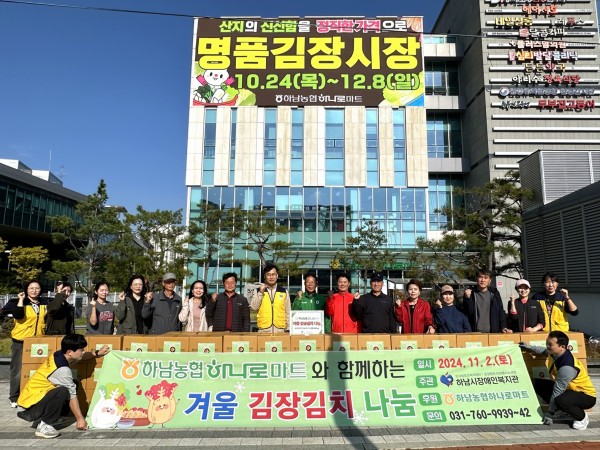 하남농협 하나로마트와 함께하는 겨울 김장김치 나눔 행사 페이지 정보 작성자 하남시장애인복지관 작성일24-11-06 10:46 조회수62 본문 하남시장애인복지관(관장 민복기)은 지난 2일 하남농협 하나로마트(조합장 노용남)로부터 겨울 김장김치 400포기와 쌀 400kg를 후원 받아 하남시 저소득 재가 장애인의 건강한 겨울나기를 위한 겨울 김장김치 나눔 행사를 진행하여 촬영한 사진입니다.기사원문보기 목록 이전글 하남시장애인복지관, 부모교육 한걸음 부모대학 진행 24.11.06 다음글 시립미사자연어린이집, 하남시장애인복지관에 아나바다 바자회 수익금 기부 24.11.05
