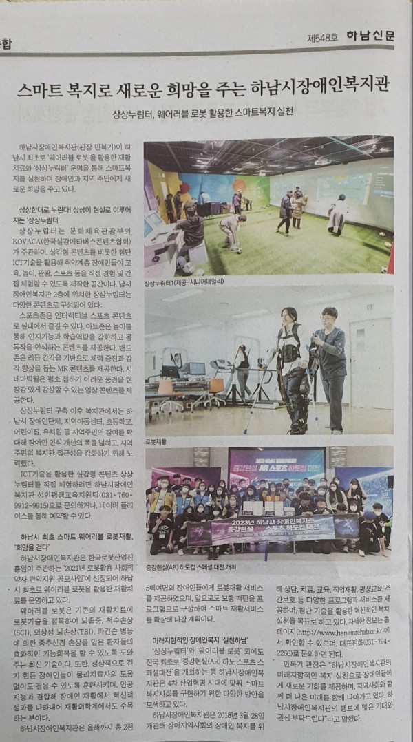 스마트 복지로 새로운 희망을 주는 하남시장애인복지관 페이지 정보 작성자 하남시장애인복지관 작성일24-07-16 19:26 조회수73 본문 '상상누림터'와 '웨어러블 로봇' 외에도 전국 최초로 '증강현실(AR) 하도 스포츠 스페셜대전'을 개최하는 등 하남시장애인복지관은 4차 산업혁명 시대에 맞춰 스마트 복지사회를 구현하기 위한 다양한 방안을 모색하고 있습니다.기사원문보기 목록 이전글 하남시장애인복지관, KB국민은행 동부지역그룹과 함께하는 복날 맞이 삼계탕 나누美 행사 성료 24.07.22 다음글 하남시장애인복지관, 아산재단 사회복지공모사업 협력기관 선정 24.07.16