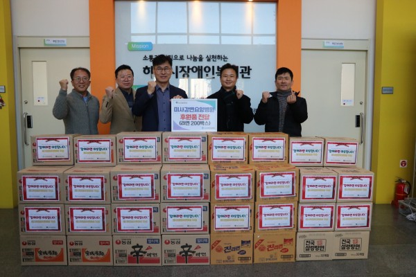 미사강변요양병원 하남시장애인복지관에 라면 200박스 후원품 전달 페이지 정보 작성자 하남시장애인복지관 작성일24-01-08 17:28 조회수52 본문 미사강변요양병원이 지난 12월 22일 하남시장애인복지관에 라면 200박스(500만원 상당의) 후원품을 전달하여 촬영한 사진입니다.기사원문보기 목록 이전글 ㈜ 산수골목장, 하남시장애인복지관 380만원 상당 특식 후원 24.02.16 다음글 ㈜케온솔루션, 하남시장애인복지관에 샴푸·바디워시 등 후원품 30박스 전달 24.01.08