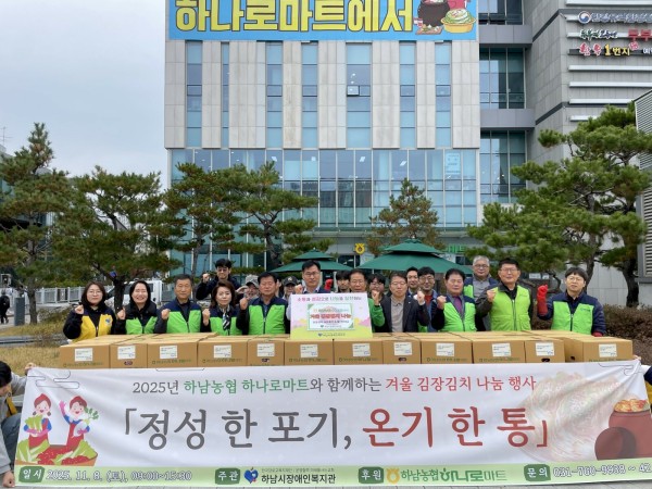 하남시장애인복지관, 2025년 하남농협 하나로마트와 함께하는 겨울 김장김치 나눔 행사 「정성 한 포기, 온기 한 통」 개최 페이지 정보 작성자 하남시장애인복지관 작성일25-12-01 09:27 조회수55 본문 하남시장애인복지관이 지난 11월 8일 하남농협 하나로마트(조합장 노용남)로부터 김장김치 400포기와 쌀 400kg을 후원받아, 하남시 저소득 재가 장애인들의 따뜻한 겨울나기를 위한 김장 나눔 행사 '정성 한 포기, 온기 한 통'을 진행하며 촬영한 사진입니다.기사원문보기 목록 이전글 하남시 장애인 활동지원기관 연합, 2025 하남시 활동지원사 힐링콘서트 성황리 개최 25.12.01 다음글 하남시장애인복지관, 국내최초 2025 제주-서울 온라인 원거리 AR E-스포츠 HADO 대회 우승 및 감사패 수상 25.11.13