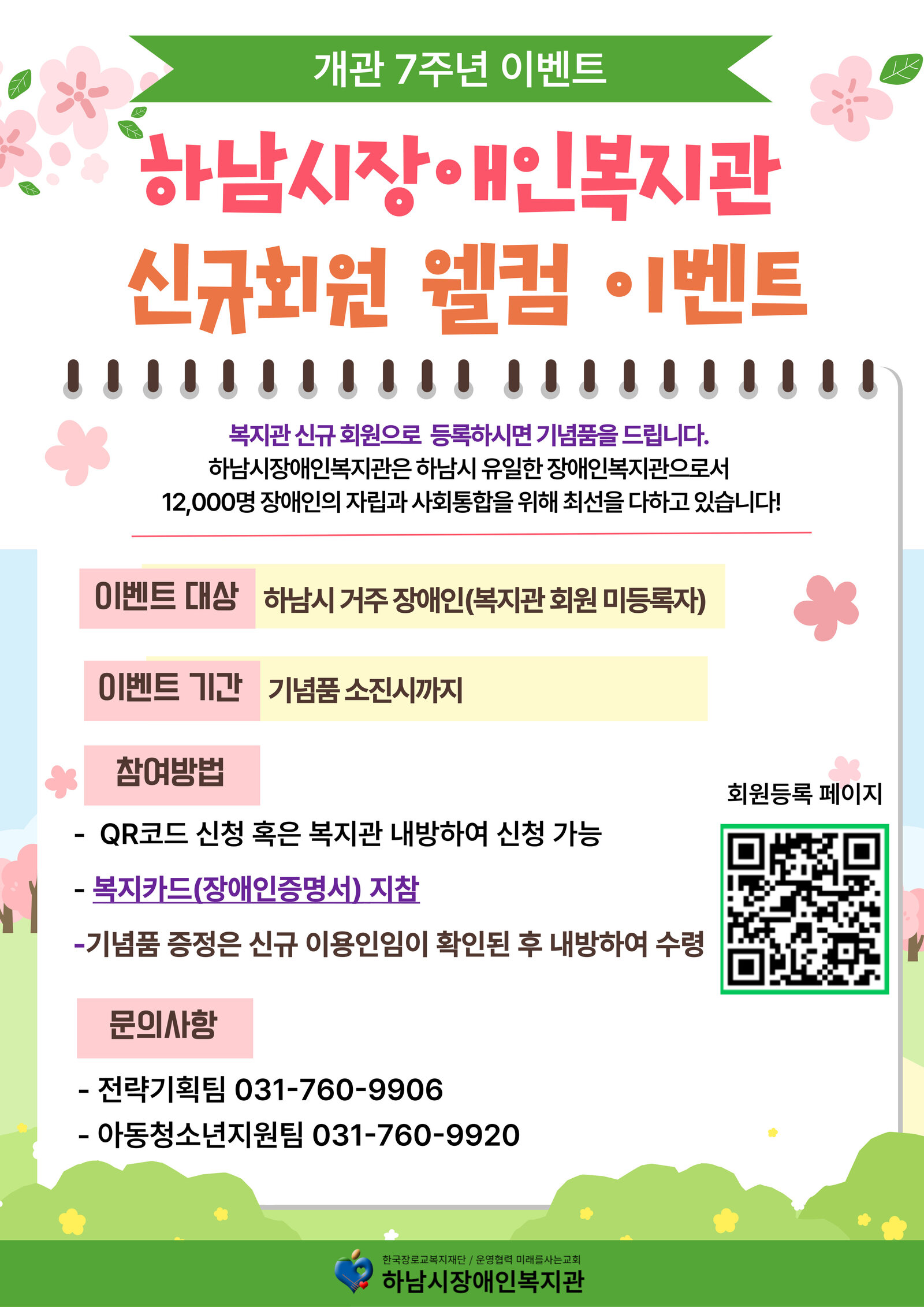 하남시장애인복지관 개관7주년 이벤트 '신규회원 웰컴 이벤트' 페이지 정보 작성자 하남시장애인복지관 작성일25-03-12 11:55 조회수343 본문 개관7주년 이벤트하남시장애인복지관 신규회원 웰컴 이벤트복지관 신규 회원으로 등록하시면 기념품을 드립니다.하남시장애인복지관은 하남시 유일한 장애인복지관으로서 12,000명 장애인의 자립과 사회통합을 위해 최선을 다하고 있습니다!이벤트 대상: 하남시 거주 장애인(복지관 회원 미등록자)이벤트 기간: 기념품 소진시까지참여방법:-큐알코드 신청 혹은 복지관 내방하여 신청가능-기념품 증정은 신규 이용인임이 확인된 후 내방하여 수령문의사항:전략기획팀 031-760-9906아동청소년지원팀 031-760-9920 목록 이전글 2025년 제 45회 장애인의날 기념 하남시장애인어울림걷기대회 25.03.13 다음글 하남시장애인복지관 개관7주년 기념 행사 25.03.12