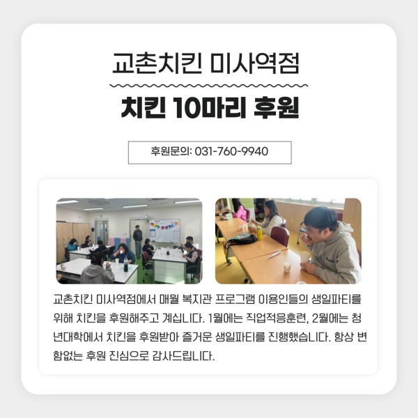 위해 치킨을 후원해주고 계십니다. 1월에는 직업적음훈련, 2월에는 청