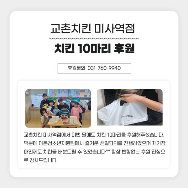 교촌치킨 미사역점에서 이번 달에도 치킨 10마리를 후원해주셨습니다.