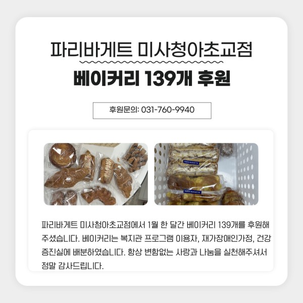 후원내역 파리바게트 미사청아초교점 베이커리 139개 기부
