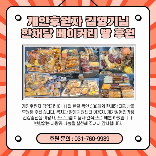 개인후원자 김영기님이 11월 한달 동안 336개의 한채당 제과빵을