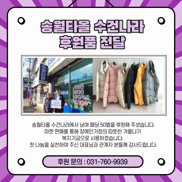 송월타올 수건나라에서 남여 패딩 50벌을 후원해 주셨습니다.