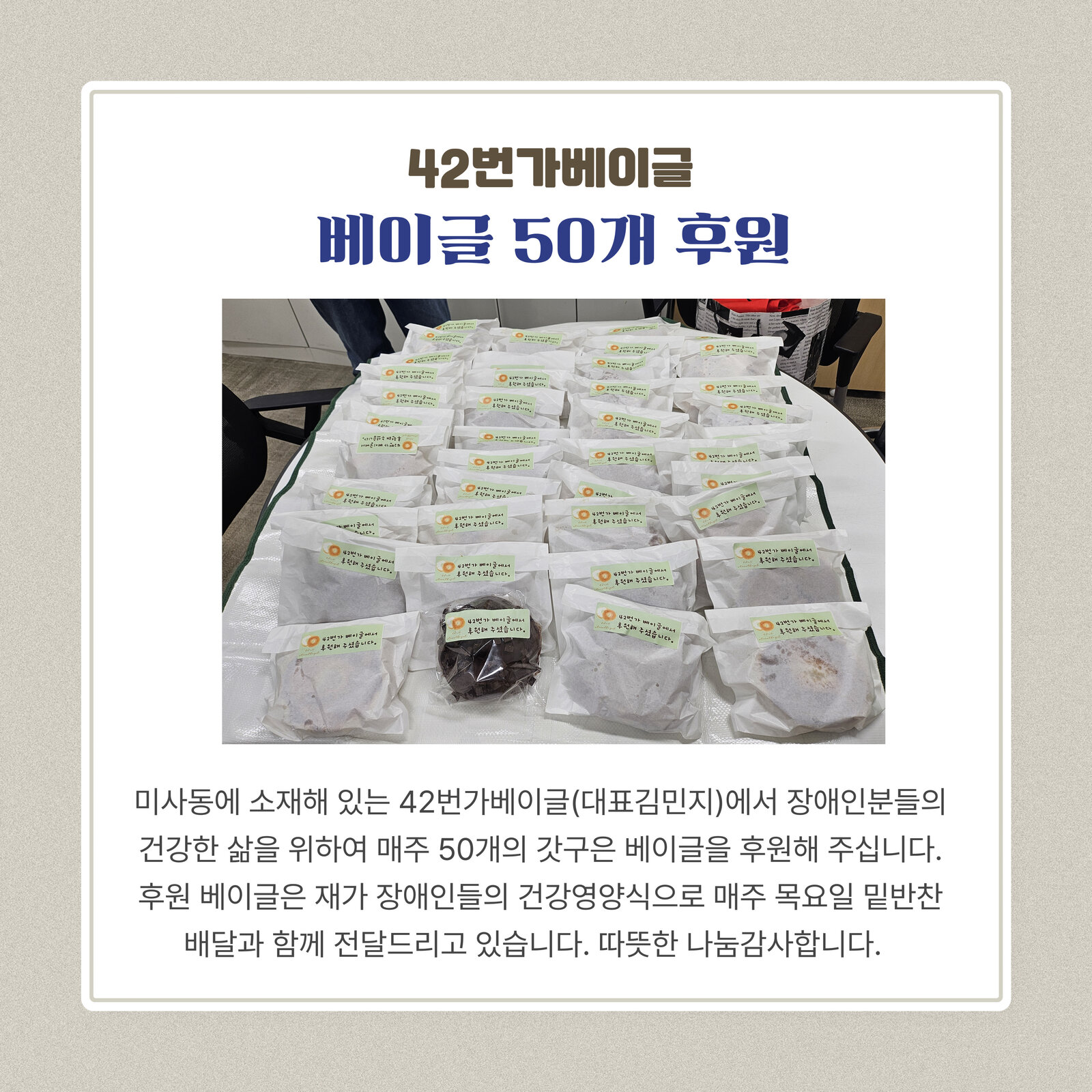 미사동에 소재해 있는 42번가베이글(대표 김민지)에서 장애인분들의 건강한 삶을 위하여 매주 50개의 갖구운 베이글을 후원해 주십니다.