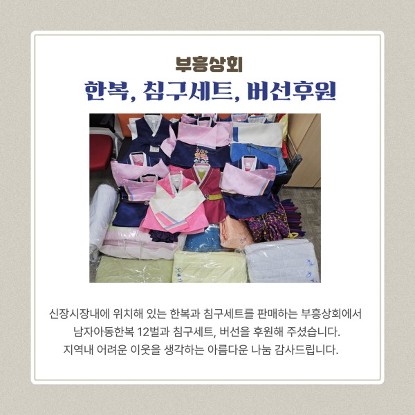 후원내역 부흥상회 페이지 정보 작성자 하남시장애인복지관 작성일25-05-16 13:48 조회수78 본문 자세히 보기 부흥상회한복, 침구세트, 버선후원신장시장내에 위치해 있는 한복과 침구세트를 판매하는 부흥상회에서남자아동한복 12벌과 침구세트, 버선을 후원해 주셨습니다.지역내 어려운 이웃을 생각하는 아름다운 나눔 감사드립니다. 목록 이전글 42번가베이글 25.05.16 다음글 42번가 베이글 25.05.16