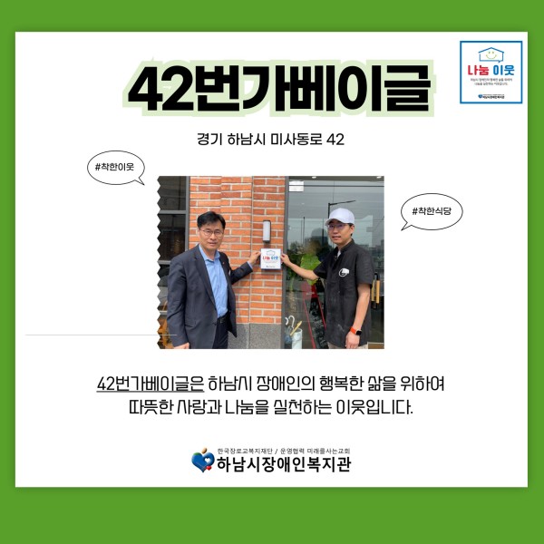나눔이웃 42번가베이글 페이지 정보 작성자 하남시장애인복지관 작성일25-05-16 13:49 조회수86 본문 자세히 보기 42번가베이글경기 하남시 미사동로 42#착한이웃 #착한식당42번가베이글은 하남시 장애인의 행복한 삶을 위하여따뜻한 사랑과 나눔을 실천하는 이웃입니다. 목록 이전글 교촌치킨 미사역점 25.05.23 다음글 부흥상회 25.05.16