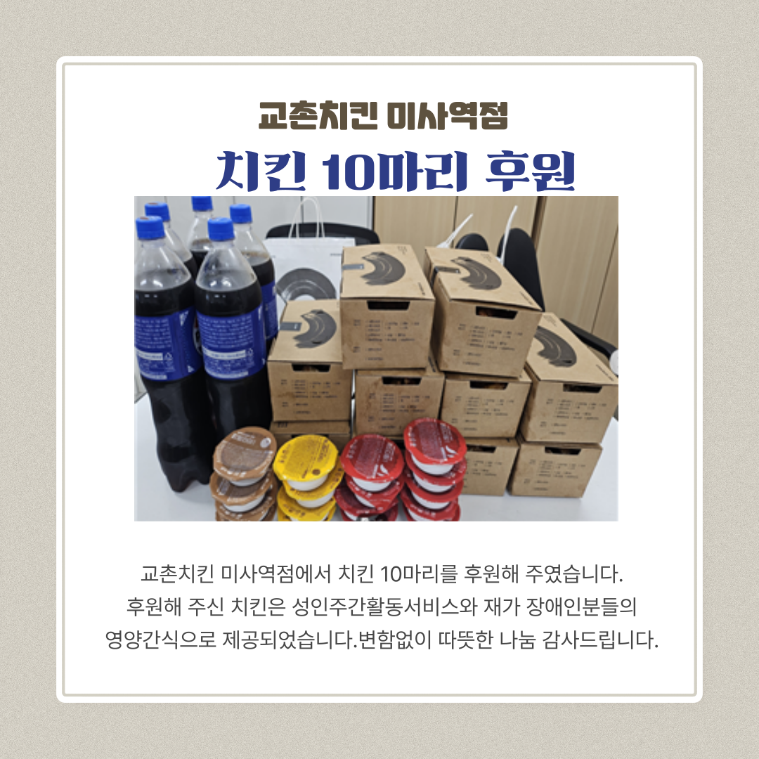후원내역 교촌치킨 미사역점 페이지 정보 작성자 하남시장애인복지관 작성일25-05-23 11:21 조회수80 본문 자세히 보기 교촌치킨 미사역점치킨 10마리 후원교촌치킨 미사역점에서 치킨 10마리를 후원해 주셨습니다.후원해 주신 치킨은 성인주간활동서비스와 재가 장애인분들의 영양간식으로 제공되었습니다.변함없이 따뜻한 나눔 감사드립니다. 목록 이전글 알파문구 미사역점 25.05.23 다음글 42번가베이글 25.05.16