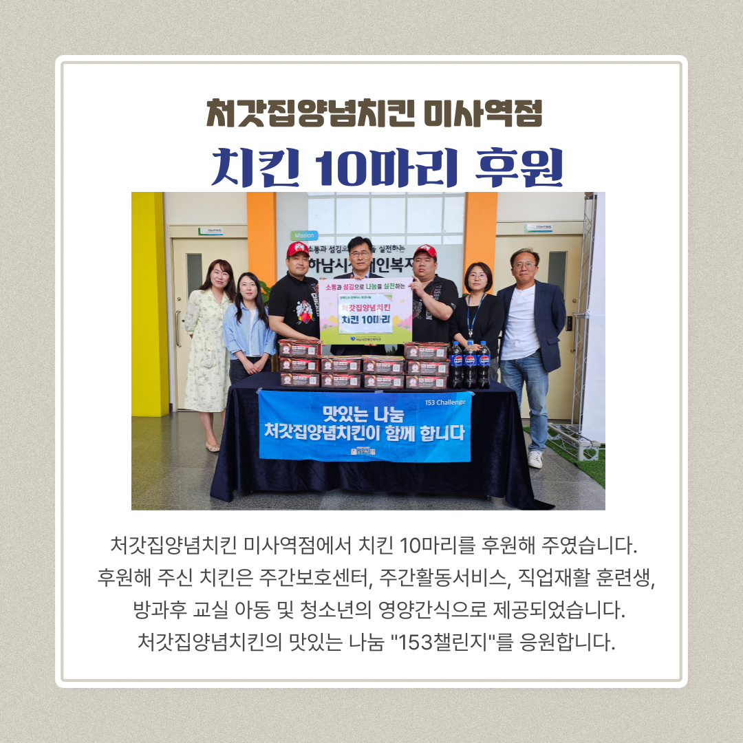 후원내역 처갓집양념치킨 미사역점 페이지 정보 작성자 하남시장애인복지관 작성일25-05-26 19:14 조회수87 본문 자세히 보기 처갓집양념치킨 미사역점에서 치킨 10마리를 후원해 주셨습니다.후원해주신 치킨은 주간보호센터, 주간활동서비스, 직업재활 훈련생 방과후 교실 아동 및 청소년의 영양간식으로 제공되었습니다.처갓집양념치킨의 맛있는 나눔 “153챌린지”를 응원합니다. 목록 이전글 연세꿈꾸는치과 25.05.28 다음글 알파문구 미사역점 25.05.23